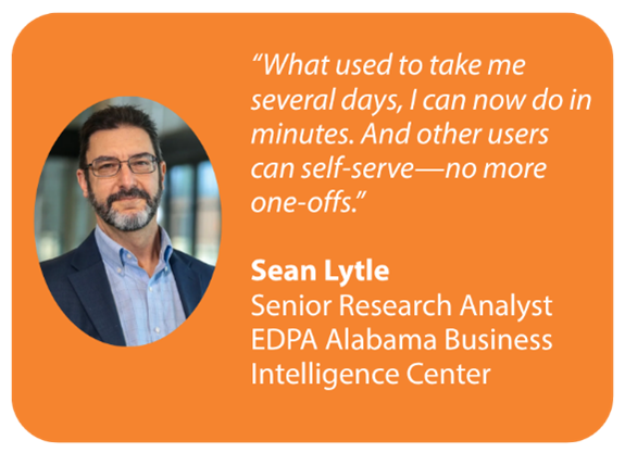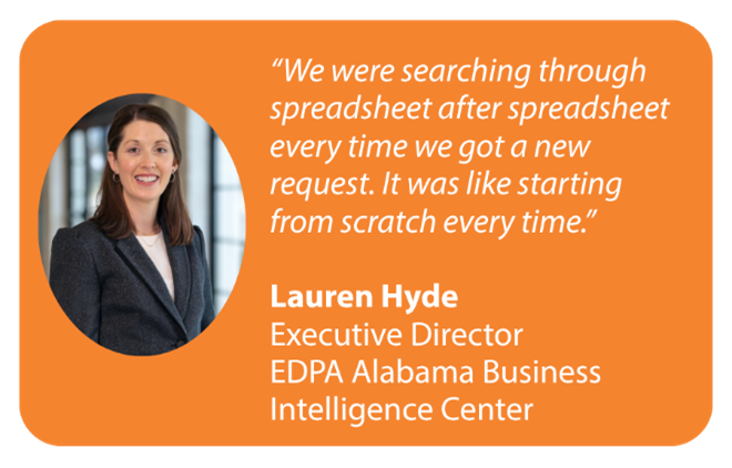 This ensures that local knowledge is captured, up-to-date, and available at the state level, allowing EDPA and its partners to present the full scope of Alabama's business capabilities to prospective companies.